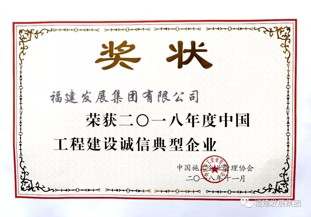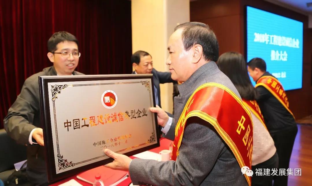 2018年12月4日,“中国工程建设诚信典型企业”表彰大会在北京举行,福建发展集团蝉联三届此项殊荣,集团公司董事长林成端先生代表公司赴京参加颁奖大会。